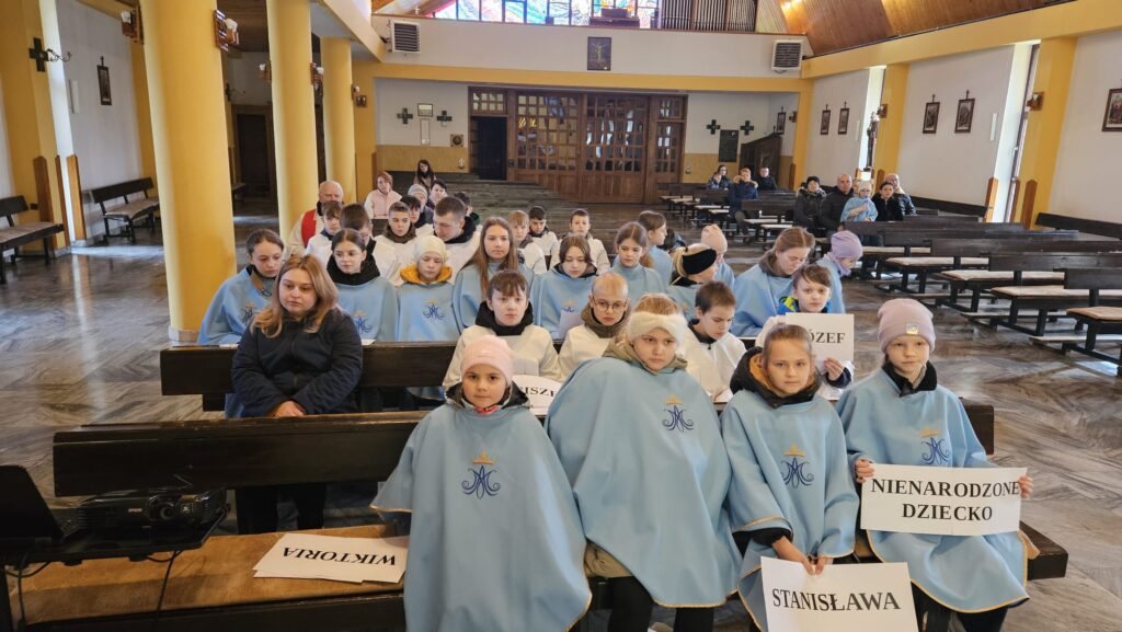 Po ich powitaniu rozpoczęliśmy nabożeństwo Drogi Krzyżowej. Była to Droga Krzyżowa przebyta z rodziną Ulmów. Poszczególne rozważania Stacji czytały Rodziny naszej parafii. Wymowne było, że w tym czasie relikwiarz trzymali najmniejsi Członkowie każdej z rodzin. Dzieci trzymały z uwagą ten relikwiarz. Można powiedzieć, że dzieci trzymały w rękach niejako relikwie swoich rówieśników, z kolei kolejne stacje Drogi Krzyżowej wraz z ich rozważaniami wpisywały się w kolejne kroki i etapy Męki Jezusa. Wydanie na śmierć…. Odarcie z szat… Śmierć… oraz… Złożenie do grobu…
