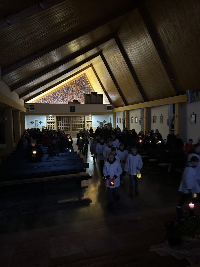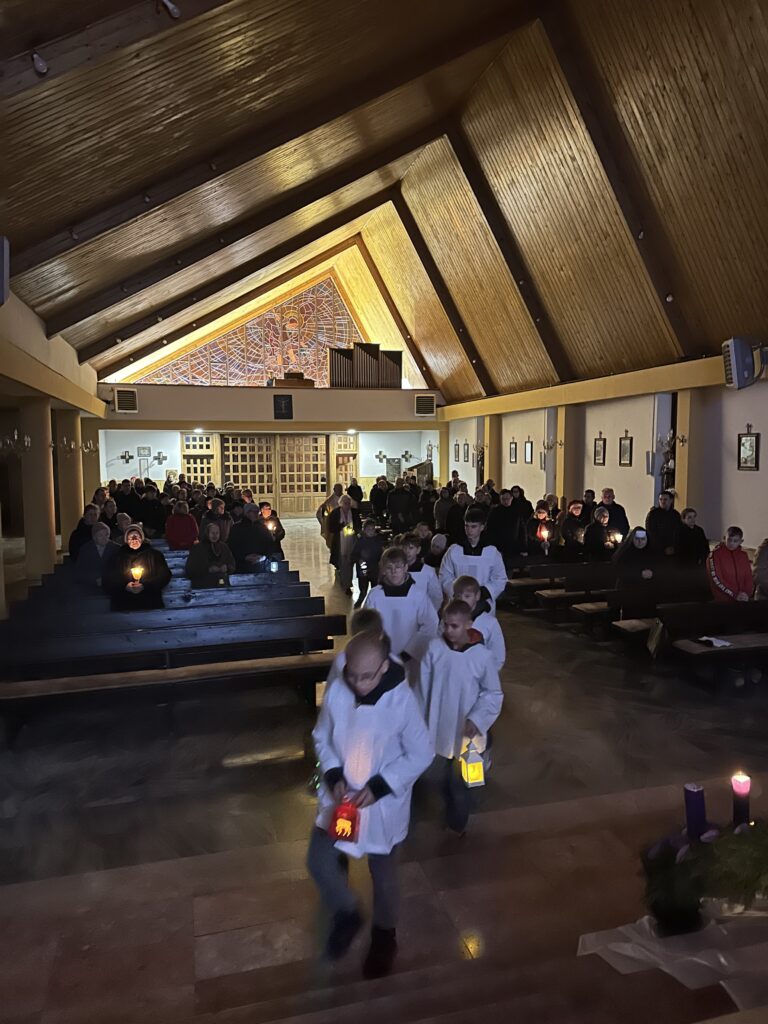 Przychodzimy jeszcze po ciemku do kościoła, w ręku trzymając lampiony. Liturgia Mszy Św. w kościele też rozpoczyna się przy zgaszonym świetle. W świątyni panuje całkowity mrok. To symbol oczekiwania na Zbawiciela, który rozświetli mroki naszych grzechów, gdy przyjdzie na ziemię. Podczas Rorat jest też śpiewany hymn Chwała na wysokości. Właśnie wtedy zapalane są światła w kościele.